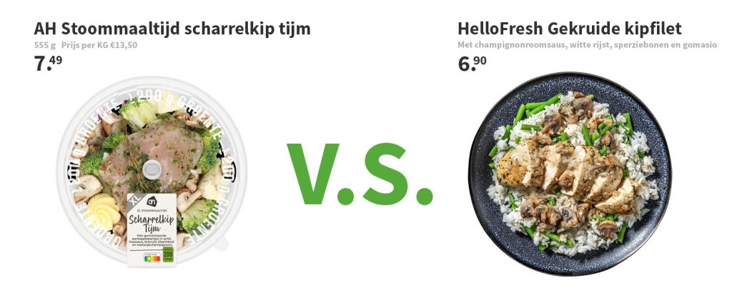 Nou, niet altijd. Ten eerste ligt het aan wat je in de supermarkt koopt. Als je van de kant-en-klare gerechten bent dan ben je zeker niet altijd goedkoper uit in de supermarkt. Zo kost een stoommaaltijd bij de Albert Heijn tussen de €5,- en €7,50. Stel dat je bij een maaltijdbox bestelt voor elke werkdag (dus vijf maaltijden), voor twee personen. Omgerekend zou je momenteel dan €6,90 per persoon, per maaltijd kwijt zijn, inclusief bezorgkosten.